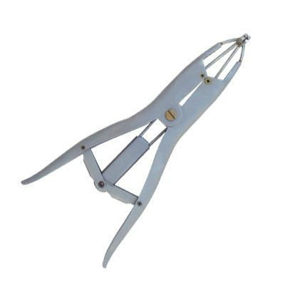 Closing the handles of this double-action, scissor-like instrument opens the jaws and dilates the rubber ring. This is slipped over the scrotum or tail and the handles released. The ring is now in place and the tool is withdrawn.